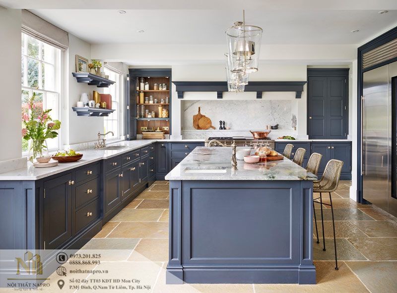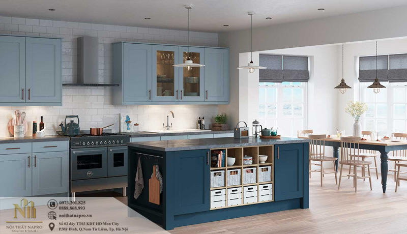Mẫu đảo bếp phong cách tân cổ điển màu xanh ấn tượng đặt ở giữa nhà bếp
