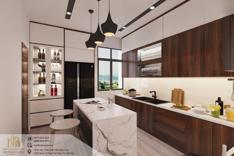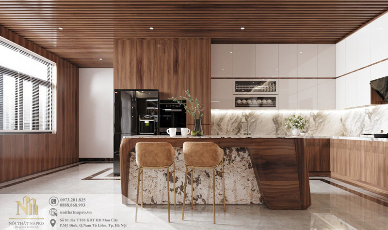 Chiếc bàn đảo bếp với kích thước tiêu chuẩn thiết kế nồi liền với tủ bếp chữ L tạo ra 1 vách ngăn phân chia phòng bếp