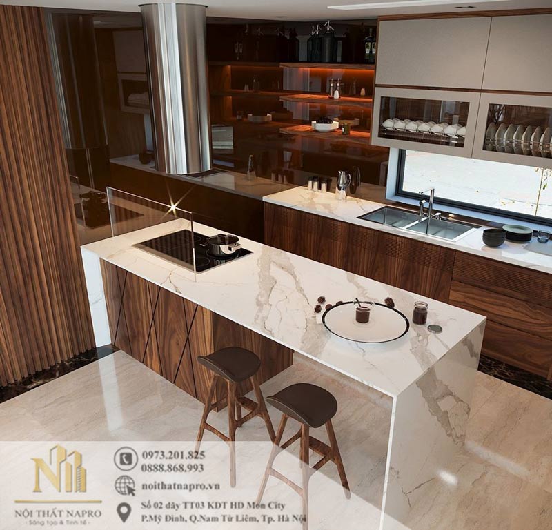 Mẫu thiết kế hệ bàn đảo bếp bằng gỗ óc chó màu vân gỗ socola sang trọng, ấm cúng