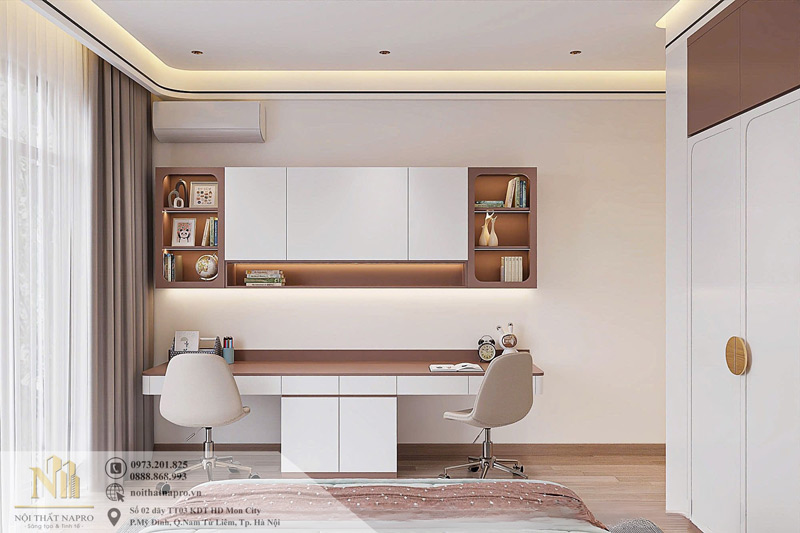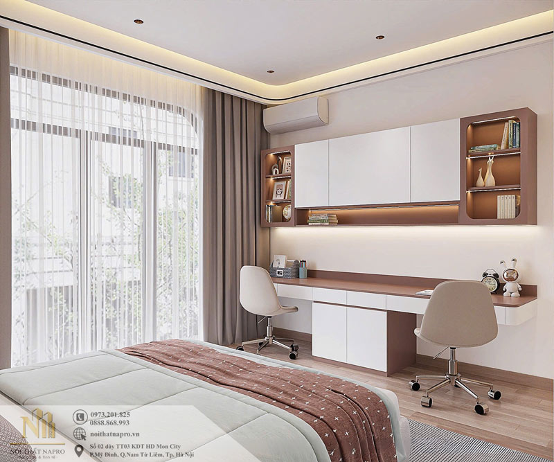 Khu vực bàn học được bố trí sát cửa sổ lớn, tận dụng ánh sáng tự nhiên, giúp việc học tập và làm việc trở nên hiệu quả hơn. Bàn dài thiết kế song song với mảng tường, có thể sử dụng cho hai người cùng ngồi. Điều này đặc biệt hữu ích với gia đình có hai con hoặc khi cần không gian làm việc rộng rãi.