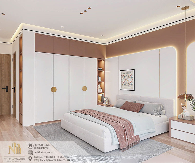 Trong xu hướng thiết kế nội thất ngày nay, phòng ngủ không chỉ là nơi nghỉ ngơi mà còn là không gian thể hiện cá tính, đồng thời đảm bảo sự tiện nghi và thẩm mỹ. Bộ phòng ngủ dành cho con gái nhà chị Mai dưới đây là một minh chứng rõ ràng cho sự kết hợp hài hòa giữa công năng sử dụng và gu thẩm mỹ hiện đại. Với gam màu trắng – nâu ấm áp cùng bố cục khoa học, căn phòng mang đến cảm giác vừa nhẹ nhàng, vừa sang trọng.