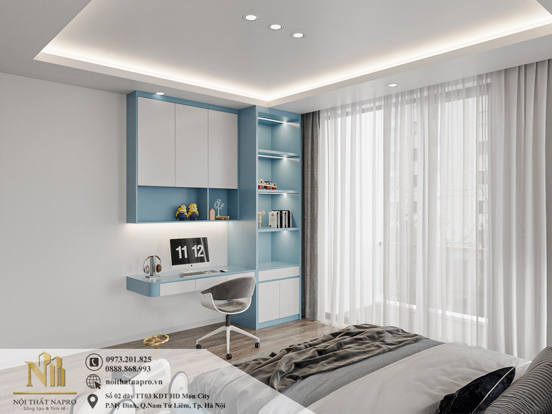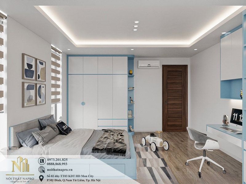 2. Ý tưởng thiết kế, bố trí lắp đặt hạng mục nội thất phòng ngủ cho bé trai màu xanh