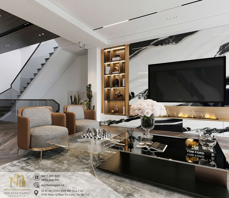 Hai bên tường là kệ gỗ cao kịch trần, kết hợp ánh sáng LED âm tủ tinh tế, vừa dùng để trưng bày rượu, sách, đồ trang trí, vừa góp phần làm cho không gian thêm phần sang trọng. Phía dưới tivi là lò sưởi giả ánh lửa, mang lại hơi ấm và cảm giác gần gũi trong những buổi sum vầy gia đình. Đây là một điểm nhấn rất hiện đại, thường thấy trong các thiết kế nội thất cao cấp.