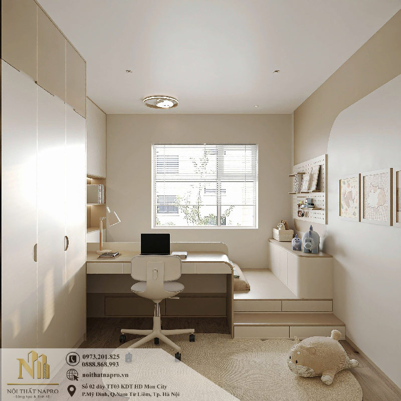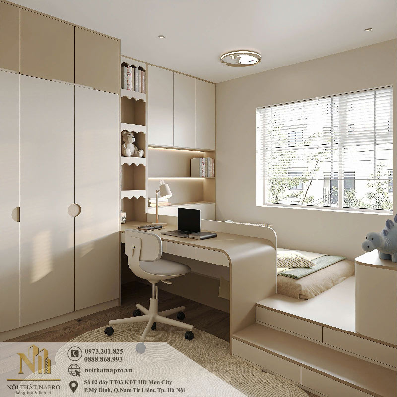 Thiết kế phòng ngủ nhỏ cho bé cần đảm bảo đồng thời ba yếu tố: thẩm mỹ – công năng – an toàn. Với phong cách hiện đại nhẹ nhàng, nội thất melamine An Cường cao cấp và cách bố trí khoa học như mẫu thiết kế trên, căn phòng không chỉ đẹp mắt mà còn mang lại trải nghiệm sống tối ưu cho trẻ. Đây là giải pháp lý tưởng cho các gia đình sở hữu phòng ngủ diện tích nhỏ nhưng muốn tạo không gian sinh hoạt đầy đủ, gọn gàng và truyền cảm hứng cho bé mỗi ngày.