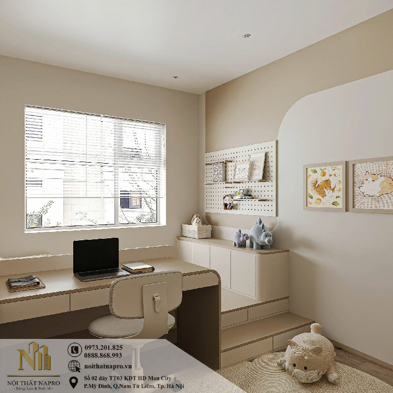 Bàn học được thiết kế cao tiêu chuẩn, kết hợp ghế xoay linh hoạt và đèn bàn ánh sáng trung tính. Bên dưới bàn có hệ ngăn kéo lưu trữ giúp bé dễ dàng sắp xếp sách vở và đồ dùng học tập.