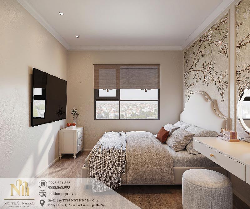 Phòng ngủ 15m2 nhà anh Đức được thiết kế theo phong cách tân cổ điển (Neo Classic) với đường nét mềm mại, thanh thoát. Các chi tiết phào chỉ nhẹ, đầu giường bo cong và bố cục cân đối tạo nên vẻ đẹp sang trọng nhưng không quá cầu kỳ. Phong cách này phù hợp với gia chủ yêu thích sự tinh tế, nhẹ nhàng và đề cao tính thẩm mỹ bền vững theo thời gian.