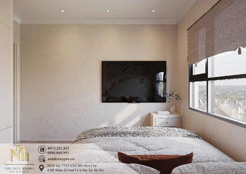 Phần tường đối diện của giường ngủ được tận dụng để tivi treo tường