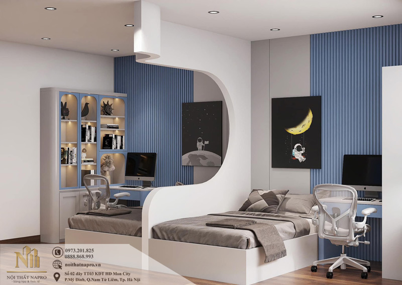 Mẫu phòng ngủ màu xanh – trắng cho bé trai là sự lựa chọn hoàn hảo, vừa đảm bảo thẩm mỹ, vừa tối ưu công năng và độ an toàn. Từ cách bố trí giường đôi, góc học tập khoa học, đến hệ tủ âm tường và trang trí chủ đề vũ trụ — tất cả tạo nên một không gian vừa sinh động, vừa phù hợp với sự phát triển của trẻ.