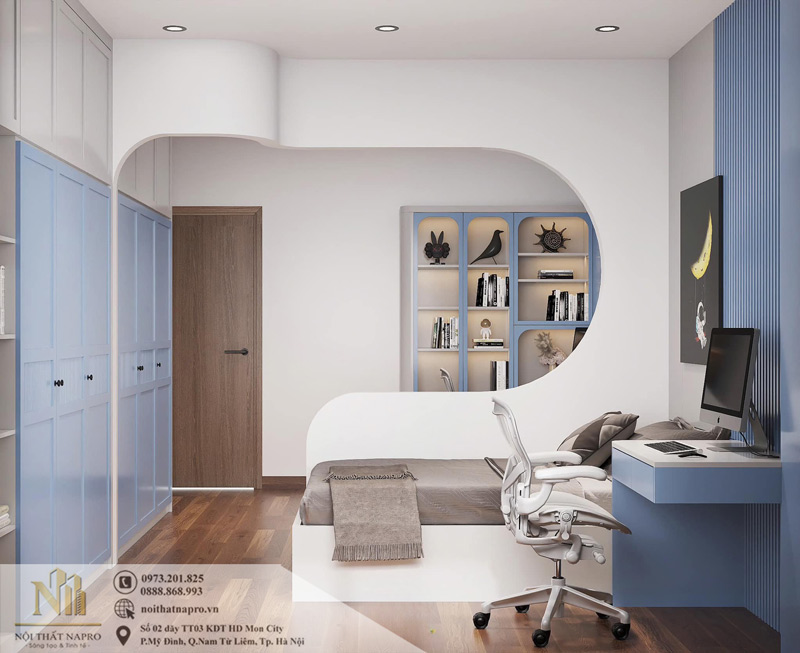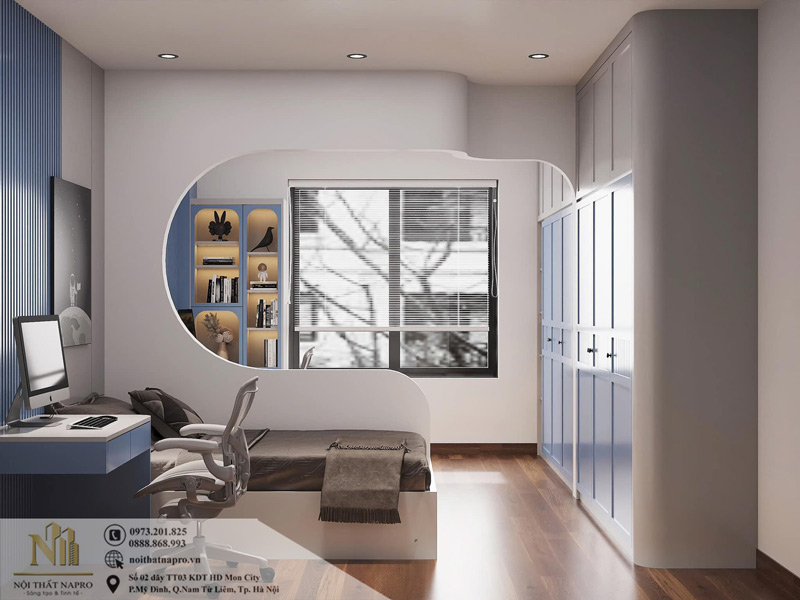 Thiết kế phòng ngủ cho bé trai đòi hỏi sự kết hợp hài hòa giữa tính thẩm mỹ, tính an toàn và công năng sử dụng. Trong các lựa chọn phổ biến hiện nay, phòng ngủ màu xanh – trắng mang lại sự tươi mới, dễ chịu và phù hợp với mọi độ tuổi của trẻ. Bài viết dưới đây sẽ phân tích từng hạng mục một cách chi tiết, giúp bố mẹ dễ dàng hình dung bố trí và đưa ra lựa chọn chính xác khi thi công thực tế.