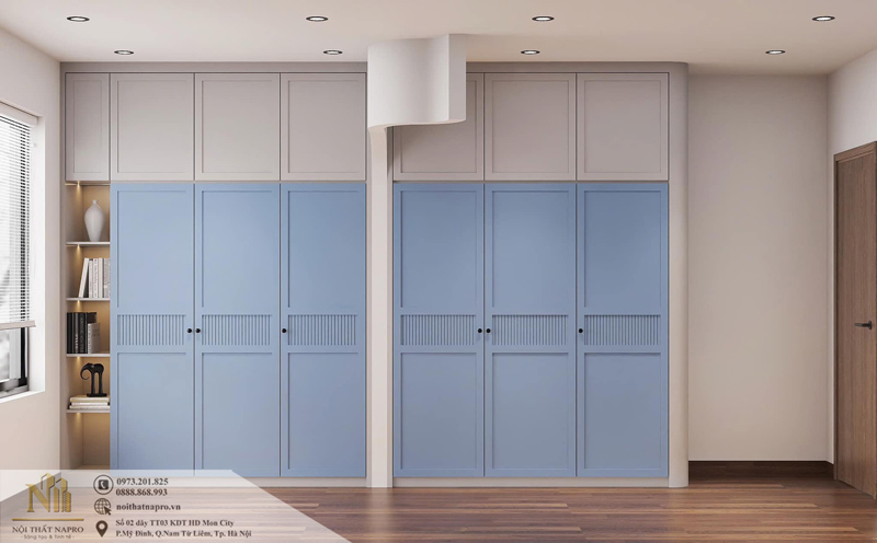 Tủ quần áo được thiết kế âm tường, chạy từ sàn lên trần, giúp tối ưu lưu trữ và giữ không gian gọn gàng. Cánh tủ màu xanh pastel kết hợp phần tủ trên màu trắng là sự phối màu tinh tế, đồng bộ với toàn bộ phòng. Tủ âm tường còn hạn chế góc cạnh, rất an toàn cho trẻ. Bên cạnh đó, kệ mở đặt ở mép tủ dùng để trưng bày sách hoặc mô hình tùy sở thích của bé, tăng tính cá nhân hóa cho phòng.