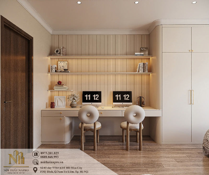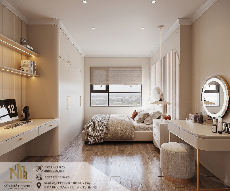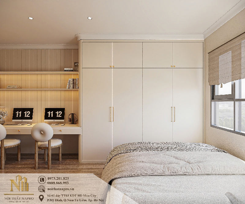 Đối diện với giường ngủ và khu vực để hệ tủ quần áo và khu vực bàn làm việc/học tập. Hệ tủ quần áo được thiết kế kịch trần, cánh phẳng với gam màu be sáng, giúp tối đa hóa không gian lưu trữ mà vẫn giữ được sự gọn gàng. Thiết kế âm tường hạn chế cảm giác cồng kềnh, đặc biệt phù hợp với phòng ngủ chung cư. Tay nắm kim loại ánh vàng nhỏ gọn tạo điểm nhấn tinh tế, góp phần nâng tầm vẻ sang trọng cho toàn bộ căn phòng.