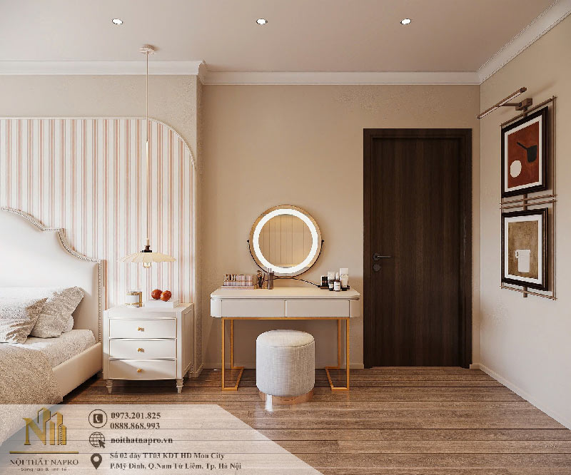 Bàn trang điểm được bố trí liền kề giường ngủ, thuận tiện cho sinh hoạt hằng ngày. Thiết kế bo tròn các góc cạnh giúp không gian trở nên mềm mại và an toàn hơn khi sử dụng. Gương tròn tích hợp đèn LED viền không chỉ hỗ trợ ánh sáng khi trang điểm mà còn đóng vai trò như một chi tiết trang trí, tạo điểm nhấn hiện đại và tinh tế cho căn phòng.