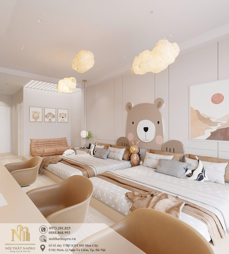 Một trong những yếu tố khiến căn phòng trở nên nổi bật chính là hệ thống chiếu sáng độc đáo. Những chiếc đèn trần thả hình mây bồng bềnh không chỉ mang lại ánh sáng dịu nhẹ mà còn gợi sự mơ mộng, phù hợp với thế giới tuổi thơ.