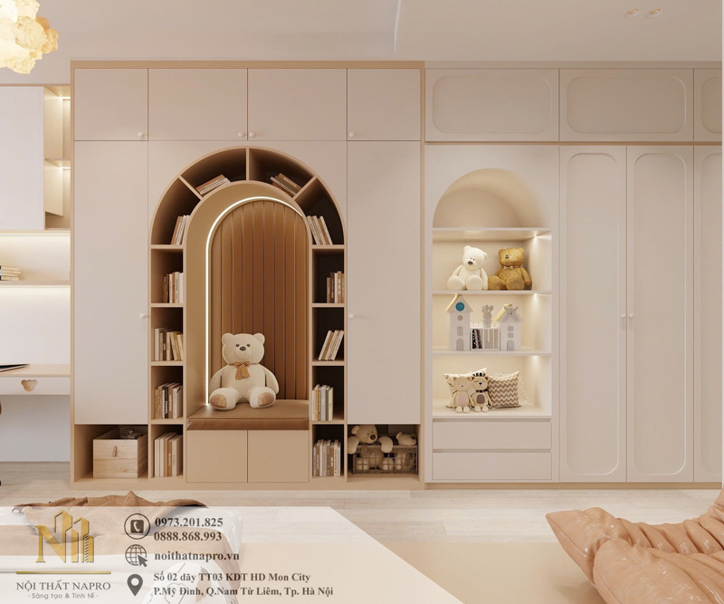 Điểm sáng tạo nằm ở hốc ngồi thư giãn hình vòm, được tích hợp đệm êm và kệ sách hai bên. Đây không chỉ là nơi đọc sách, vui chơi mà còn tạo điểm nhấn độc đáo cho căn phòng. Bên cạnh đó, các ô hở trưng bày gấu bông, đồ chơi được bố trí khéo léo, tăng thêm phần sinh động và thể hiện cá tính của trẻ.