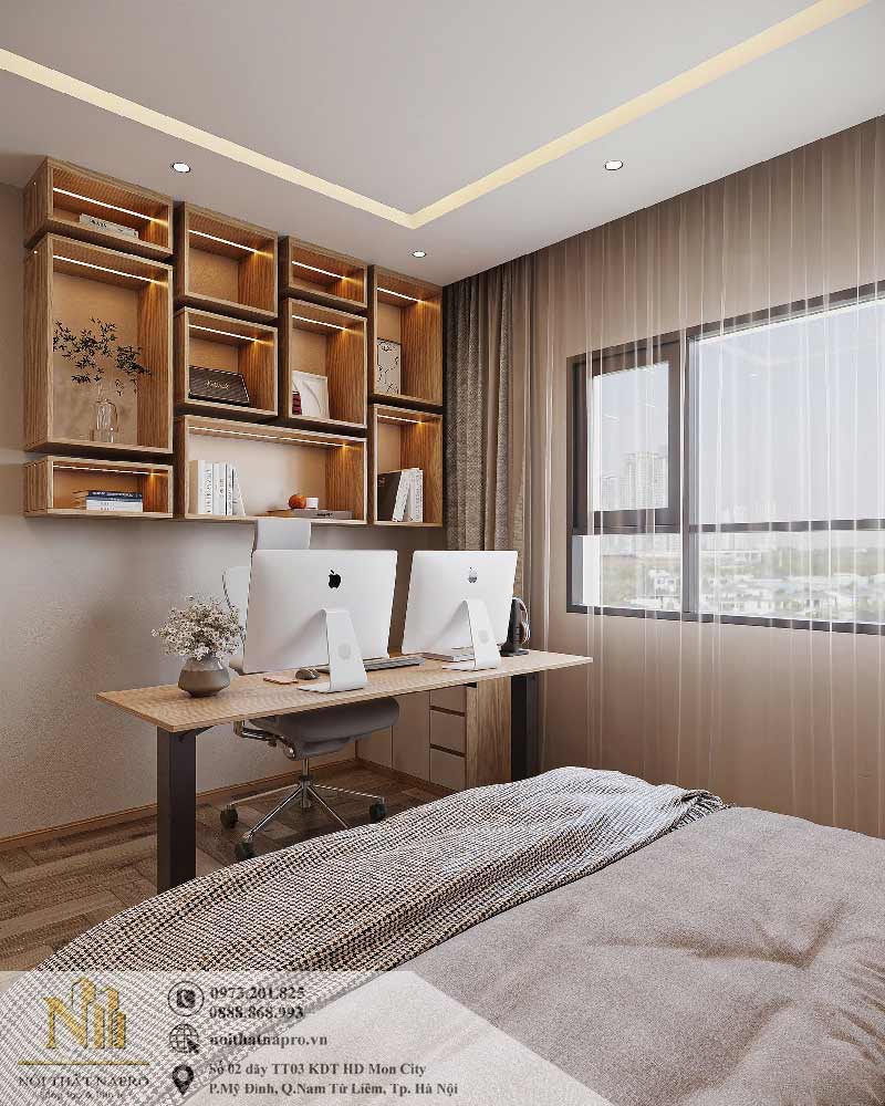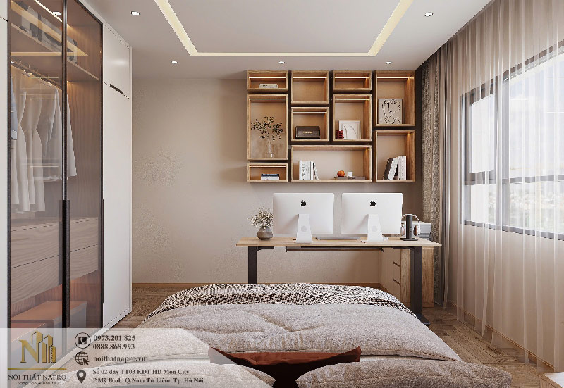 Khu vực đối diện giường ngủ được tối ưu để bàn làm việc và kệ sách treo