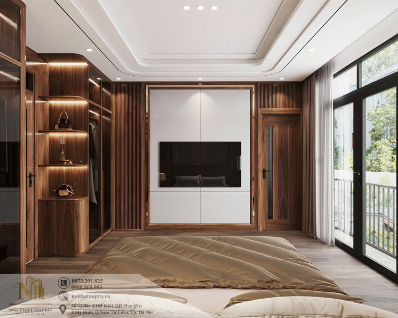 Phòng ngủ được thiết kế theo phong cách hiện đại pha chút bán cổ điển, sử dụng chất liệu gỗ óc chó tự nhiên làm chủ đạo. Từng chi tiết trong không gian đều được chăm chút tỉ mỉ – từ vách ốp đầu giường, tủ quần áo, bàn trang điểm cho tới kệ tivi – tất cả tạo nên một tổng thể đồng nhất, hài hòa và đầy ấm cúng.