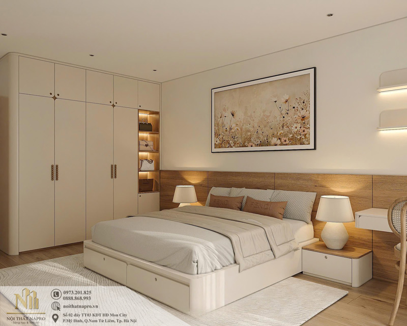 Phòng ngủ được thiết kế theo phong cách modern minimalist (hiện đại tối giản), sử dụng các mảng màu trung tính như be, trắng và nâu gỗ nhạt. Sự phối hợp hài hòa này giúp căn phòng trở nên ấm áp, nhẹ nhàng nhưng vẫn giữ được nét thanh lịch.