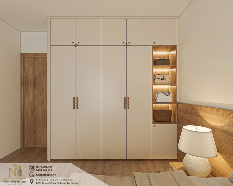 Phần tủ quần áo được thiết kế to rộng, nhiều ngăn giúp gia chủ tha hồ lưu trữ đồ đạc