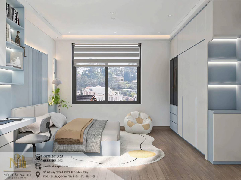 Ngay cạnh giường, bàn học được tích hợp liền kệ sách và tủ treo tường, giúp tận dụng tối đa diện tích mà vẫn giữ được sự gọn gàng. Hệ tủ mở – đóng kết hợp đèn LED âm tủ không chỉ đáp ứng nhu cầu lưu trữ mà còn tạo điểm nhấn trang trí ấn tượng. Bàn học đặt cạnh cửa sổ, tận dụng ánh sáng tự nhiên, kết hợp ghế xoay tiện nghi, mang lại không gian học tập – làm việc thoải mái.