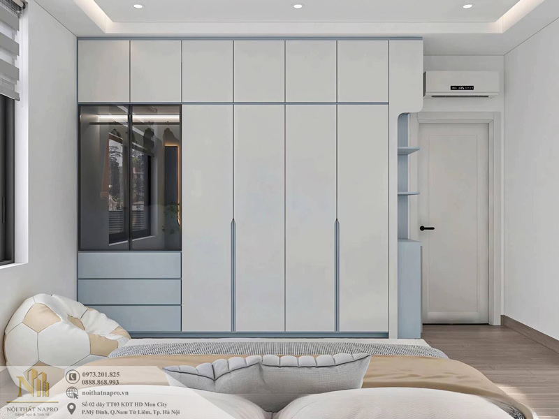 Phần hệ tủ quần áo được thiết kế kịch trần mang đến nhiều không gian lưu trữ cho gia chủ
