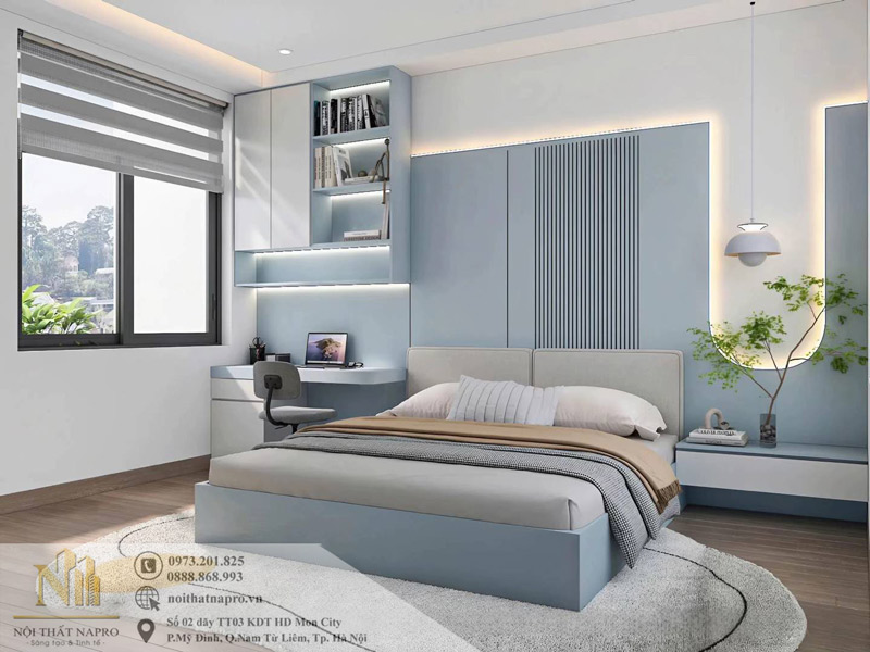 Phòng ngủ được thiết kế theo phong cách hiện đại với tone màu xanh pastel kết hợp trắng xám chủ đạo. Đây là bảng màu nhẹ nhàng, mang đến cảm giác dễ chịu, đồng thời tạo hiệu ứng mở rộng không gian. Cách phối màu tinh tế giúp căn phòng luôn giữ được vẻ thanh lịch, phù hợp với nhiều đối tượng sử dụng.
