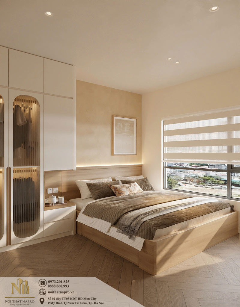 Giường ngủ được bố trí tại vị trí trung tâm phòng, tựa lưng vào hệ vách gỗ melamine có tích hợp đèn led chạy dọc. Ánh sáng hắt nhẹ này giúp không gian trở nên ấm hơn vào ban đêm và tăng tính thư giãn. Khung giường với tone gỗ sáng tạo cảm giác rộng rãi, thoáng nhẹ. Bộ chăn ga màu kem – nâu đồng điệu với toàn bộ căn phòng, góp phần hoàn thiện phong cách tối giản nhưng tinh tế. Cách đặt giường hướng về phía cửa sổ còn giúp người dùng tận hưởng ánh sáng tự nhiên và view thoáng đãng mỗi sáng thức dậy.