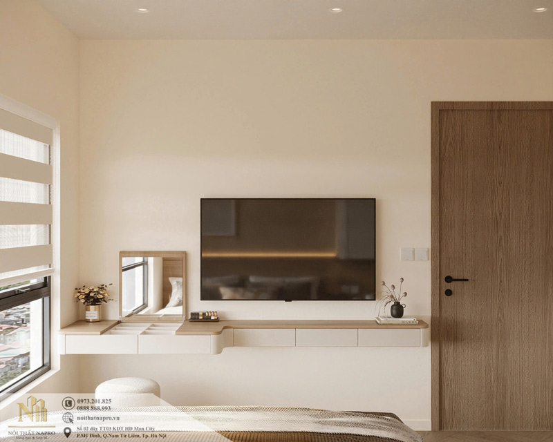 Bộ kệ tivi liền bàn trang điểm được thiết kế treo tường chạy dài theo mảng tường đối diện giường. Đây là giải pháp tối ưu diện tích thường thấy trong các thiết kế hiện đại. Thiết kế này vừa tiết kiệm không gian di chuyển, vừa tạo sự liên kết liền mạch giữa các hạng mục nội thất. Bàn trang điểm nhỏ gọn nhưng đầy đủ công năng, có gương, đôn ngồi và không gian để đồ hợp lý. Sự đơn giản trong đường nét giúp khu vực này vừa tiện dụng vừa giữ được tính thẩm mỹ tinh tế.