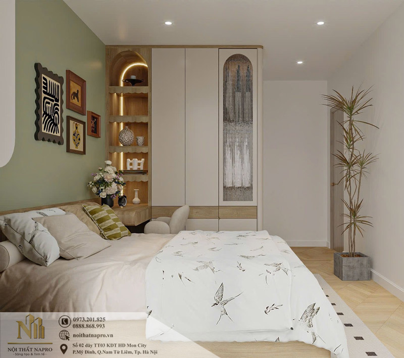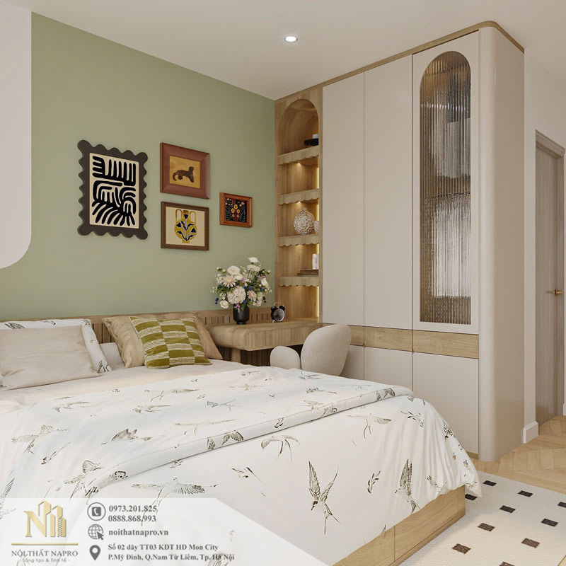 Một trong những chi tiết ấn tượng nhất của căn phòng chính là mảng tường đầu giường được sơn màu xanh olive pastel. Đây là gam màu được đánh giá cao trong thiết kế phòng ngủ nhờ khả năng giảm căng thẳng và tạo cảm giác thư giãn tự nhiên. Phần bo cong sơn trắng tạo hình học mềm mại, cân bằng bố cục và mang lại nét độc đáo cho tổng thể. Bộ tranh nghệ thuật treo tường với khung gỗ và họa tiết boho là điểm nhấn mang tính thẩm mỹ cao, giúp không gian trở nên ấm cúng, sinh động và có chiều sâu hơn.