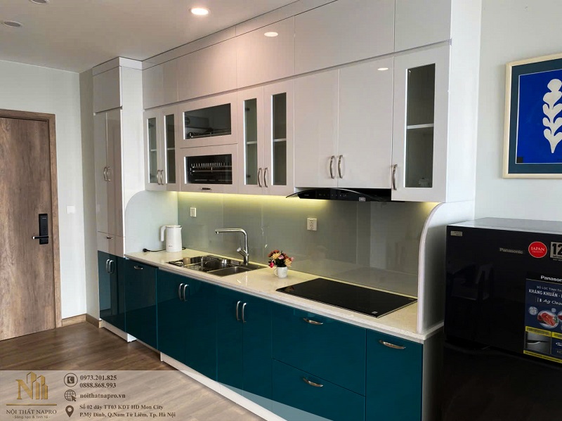 Vì diện tích không gian để làm phòng bếp nhà cô Hường rất nhỏ hẹp nên Napro đã thiết kế cho gia đình hệ tủ bếp gỗ acrylic NAC31 chữ I nhỏ xinh. Bộ tủ là sự kết hợp hoàn hảo giữa 2 tone màu trắng trơn tinh khôi với màu xanh lạ mắt. Tạo nên 1 căn bếp sang trọng, hiện đại.