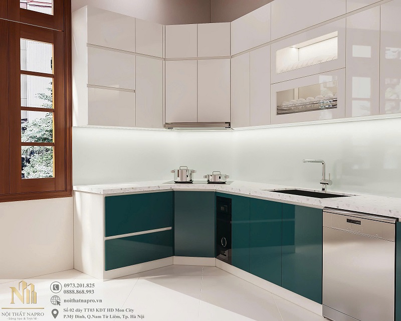 Mẫu tủ bếp acrylic này gây ấn tượng mạnh nhờ sự kết hợp màu sắc tinh tế: tủ trên phủ acrylic trắng bóng gương, tủ dưới sử dụng màu xanh ngọc đậm. Sự đối lập này mang lại cảm giác sang trọng nhưng vẫn trẻ trung, hiện đại.