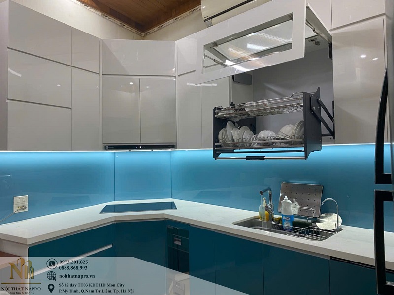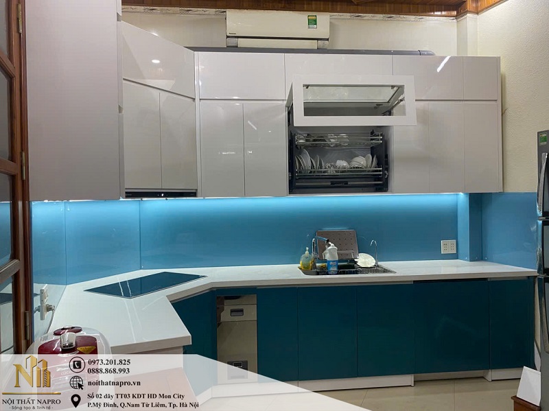 Tủ bếp acrylic NAC33 nhà cô Tuất với sự kết hợp màu trắng - xanh cực bắt mắt, đẹp