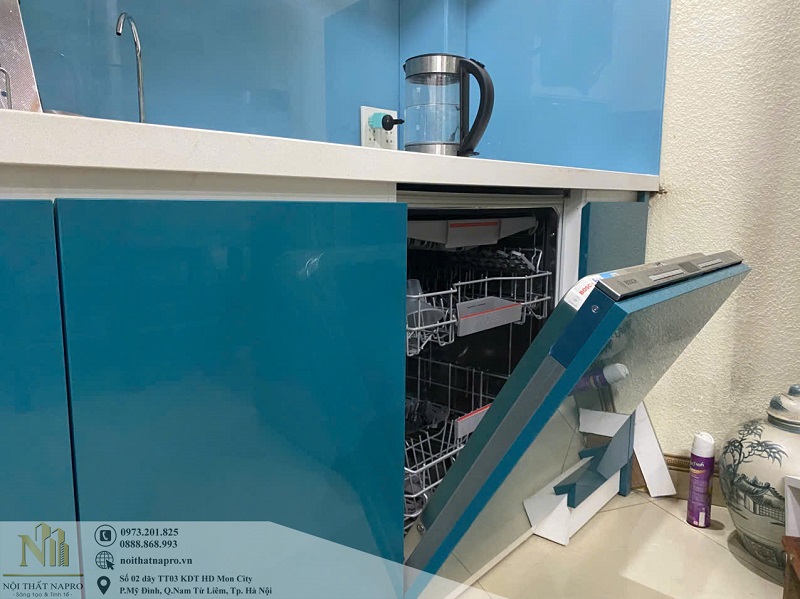 Máy rửa bát được đặt ngay cạnh chậu rửa, tạo sự liền mạch trong thao tác dọn dẹp. Sau khi rửa sơ, bát đĩa được cho trực tiếp vào máy, tiết kiệm thời gian và công sức. Vị trí này cũng giúp gian bếp gọn gàng và khoa học hơn.