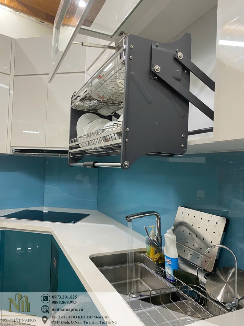 Chậu rửa đặt ở cạnh dài, nằm trung tâm, đóng vai trò là điểm nối giữa sơ chế và nấu ăn. Bên trên chậu là giá úp bát thông minh gắn trong hộc tủ, có cửa kính để vừa tiện dụng vừa thẩm mỹ. Phía dưới chậu rửa có thể bố trí thùng rác âm tủ và kệ để dung dịch tẩy rửa. Ưu điểm vượt trội của chiếc kệ úp bát này là có thể nâng lên hạ xuống 1 cách nhẹ nhàng, phù hợp với mọi thành viên trong gia đình đều có thể sử dụng.
