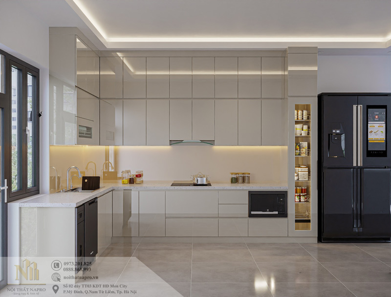Một điểm nổi bật khác trong thiết kế chính là hệ tủ trên được làm cao sát trần. Cách làm này không chỉ gia tăng diện tích lưu trữ mà còn loại bỏ tình trạng bám bụi trên nóc tủ, vốn thường gây khó khăn trong việc vệ sinh. Tổng thể thiết kế mang đến cảm giác gọn gàng, sang trọng và tối ưu cho mọi không gian sống.