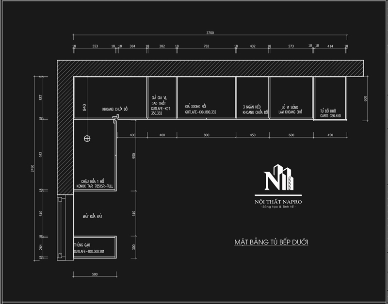 Bản vẽ chi tiết 2D kích thước phần kệ tủ bếp dưới