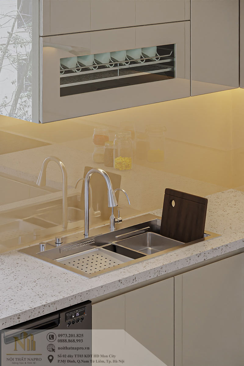 Cạnh chữ L còn lại được bố trí chậu rửa đôi inox kết hợp phụ kiện thông minh như rổ lọc, thớt trượt và khay úp. Phía trên là tủ úp bát với cánh kính trong suốt, giúp bát đĩa luôn khô ráo và sạch sẽ. Ngay bên dưới chậu rửa, máy rửa bát âm tủ được tích hợp gọn gàng, tạo nên quy trình rửa – úp – cất bát đĩa khép kín, tiết kiệm thời gian và công sức.