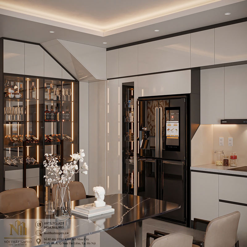 Bên cạnh khu vực nấu nướng, bộ tủ bếp còn được kết hợp với tủ rượu hiện đại, thiết kế dạng âm tường tinh gọn, kết hợp kính trong suốt và đèn LED hắt sáng. Điều này không chỉ gia tăng tính thẩm mỹ, mà còn thể hiện đẳng cấp và gu thưởng thức của gia chủ.