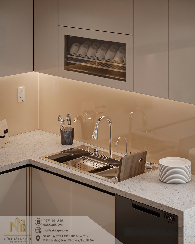 Hệ thống giá úp bát inox 304 gắn bên trong tủ trên, giúp việc cất trữ bát đĩa sau khi rửa trở nên tiện lợi và gọn gàng. Giá để xoong nồi, kệ kéo đa năng giúp tối ưu diện tích, dễ dàng sắp xếp đồ dùng nấu ăn ngăn nắp, khoa học. Ngoài ra, căn bếp còn được trang bị máy rửa bát âm tủ hiện đại, tiết kiệm thời gian và công sức cho gia đình. Sự kết hợp này không chỉ gia tăng tính tiện nghi mà còn góp phần tạo nên phong cách sống hiện đại, thoải mái cho gia chủ.