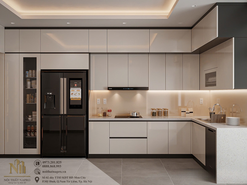 Tủ bếp sử dụng tone màu chủ đạo là gam màu trắng sáng kết hợp với viền đen tinh tế mang đến sự hài hòa, thanh lịch và tạo điểm nhấn nổi bật. Đây là sự lựa chọn hoàn hảo cho những gia đình yêu thích phong cách tối giản nhưng vẫn đảm bảo sự sang trọng và cuốn hút.
