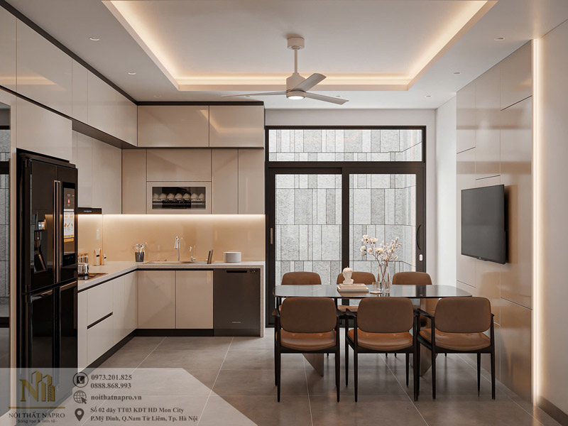Việc đặt bàn ăn trong cùng không gian không chỉ tiết kiệm diện tích, mà còn tăng sự kết nối giữa các thành viên trong gia đình. Đây là thiết kế phù hợp cho nhịp sống đô thị hiện đại, nơi gia đình quây quần bên nhau trong những bữa cơm ấm cúng.
