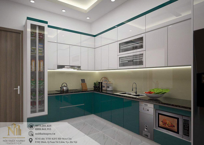 Tủ bếp Acrylic NAC37 chữ L màu xanh ấn tượng, hiện đại