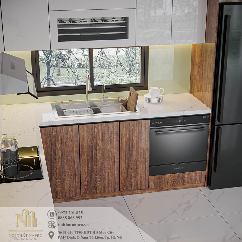 Khu vực bồn rửa được đặt cạnh cửa sổ lớn, giúp tận dụng ánh sáng tự nhiên và đảm bảo thông thoáng, khô ráo. Ngay bên cạnh là máy rửa bát âm tủ, đồng bộ với hệ thống tủ dưới, giúp không gian trở nên liền mạch và gọn gàng.