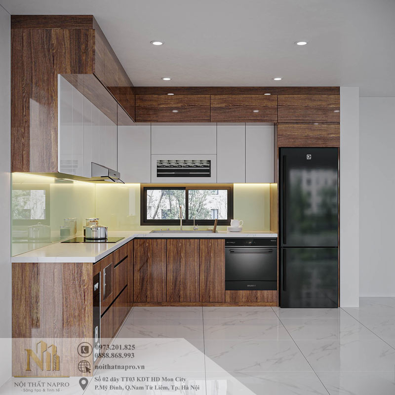 Mẫu tủ bếp sử dụng sự kết hợp giữa màu vân gỗ trầm ấm và trắng bóng Acrylic, tạo nên hiệu ứng tương phản tinh tế.