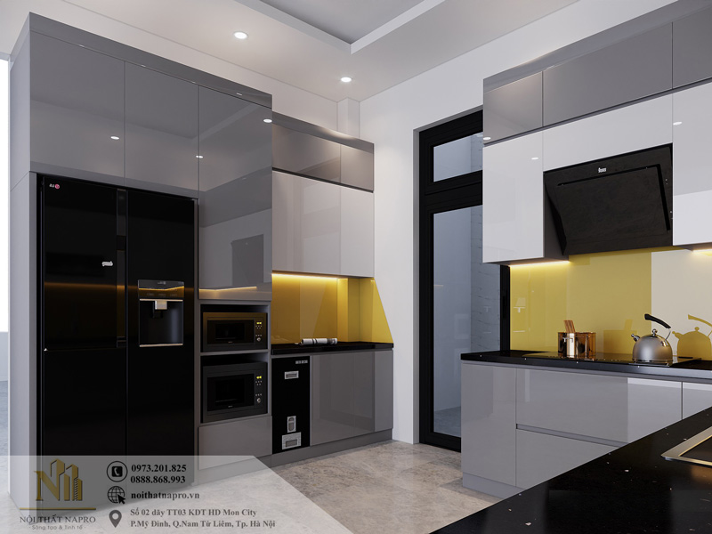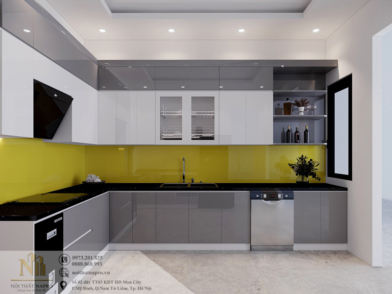 Không gian bếp nổi bật với chất liệu Acrylic bóng gương – một trong những vật liệu cao cấp hàng đầu hiện nay. Bề mặt bóng mịn, phản chiếu ánh sáng tốt giúp căn bếp luôn sáng sủa và sang trọng. Gam màu xám – trắng hiện đại kết hợp với kính ốp bếp vàng chanh tạo điểm nhấn trẻ trung, năng động mà vẫn ấm cúng.