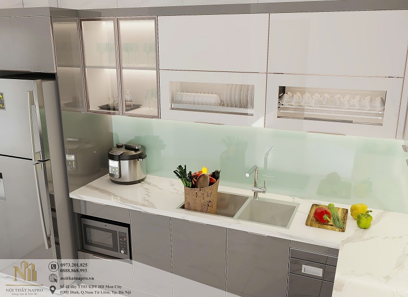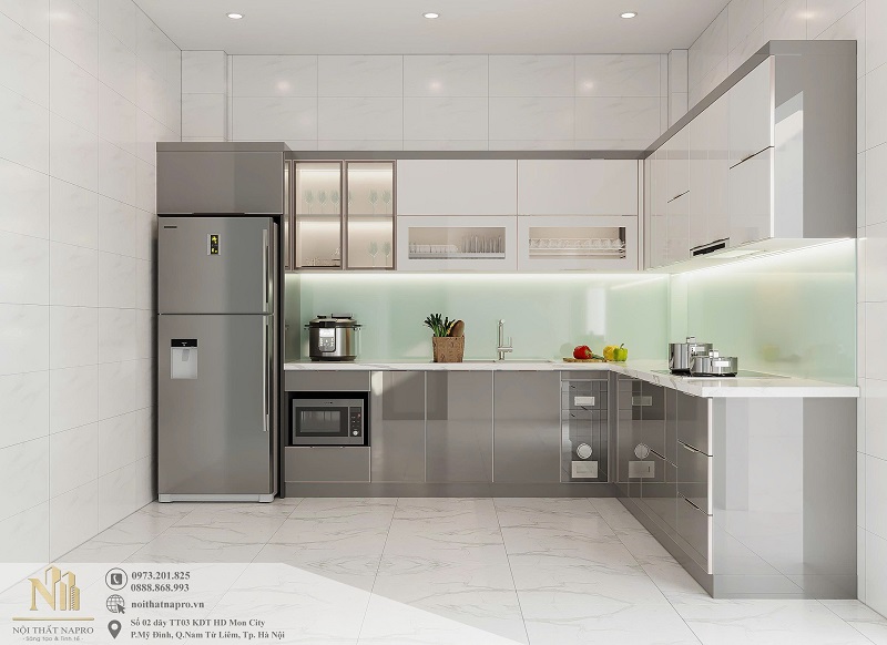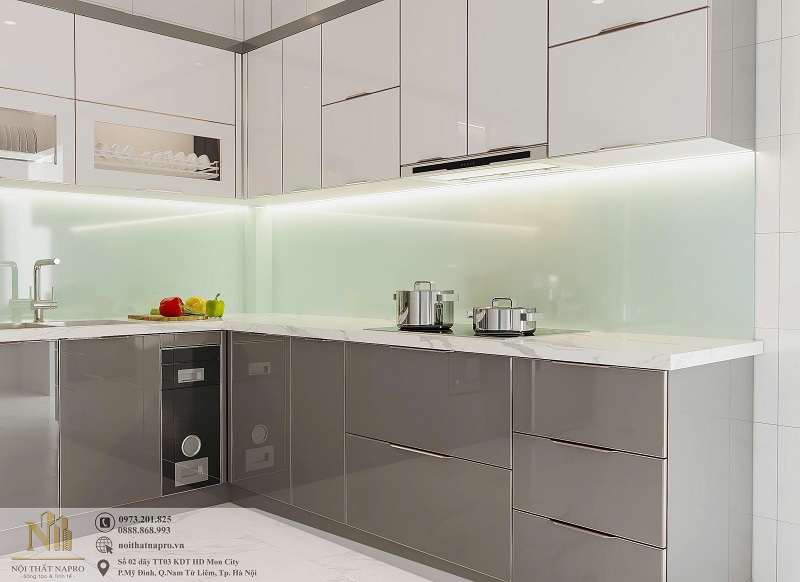 Sự kết hợp giữa hai gam màu trắng – xám bóng cùng bề mặt đá sáng mang lại vẻ đẹp tối giản nhưng sang trọng. Thiết kế này phù hợp với những căn hộ chung cư, nhà phố hiện đại, mang lại không gian bếp vừa gọn gàng, vừa đẳng cấp, đáp ứng đầy đủ công năng cho sinh hoạt hằng ngày.