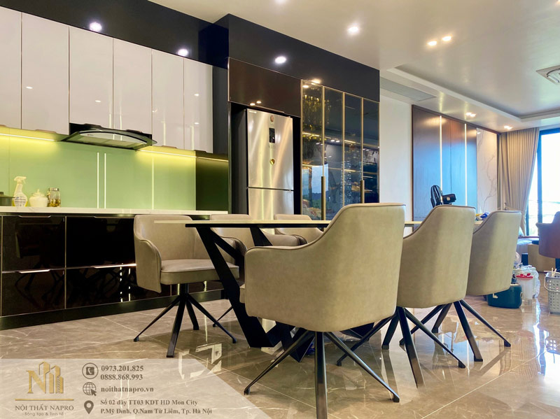 Bên cạnh khu bếp chính là hệ tủ cao kết hợp tủ rượu kính viền vàng, được xem là chi tiết nổi bật nhất trong thiết kế này. Phần tủ cao được dùng để đặt tủ lạnh âm không gian, đảm bảo sự đồng bộ và gọn gàng.