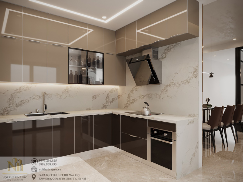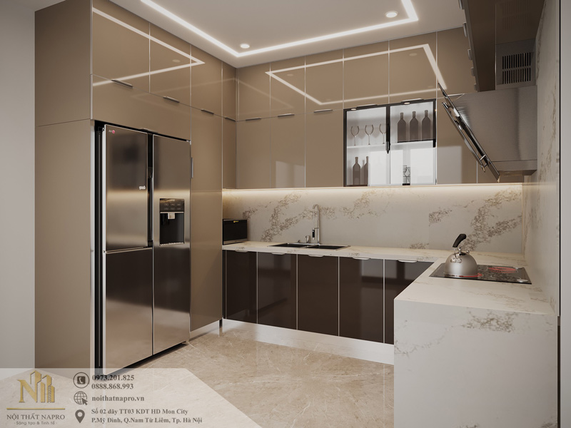 Bộ tủ bếp với chất liệu cánh kính bóng gương kết hợp màu nâu – be sữa sang trọng, giúp căn bếp vừa hiện đại, vừa ấm cúng. Bề mặt bóng sáng phản chiếu ánh sáng tự nhiên, tạo hiệu ứng không gian mở và sạch sẽ hơn.