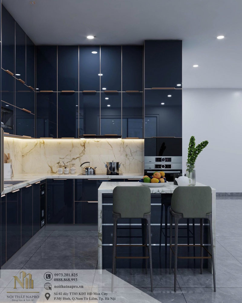 Điểm nổi bật của mẫu bếp này chính là màu xanh đen ánh bóng của hệ tủ. Tông màu mang lại cảm giác sang trọng, hiện đại và vô cùng “nịnh mắt”. Khi kết hợp cùng đá vân mây trắng kem ở mặt bếp và bàn đảo, không gian trở nên hài hòa và cuốn hút, giống như một căn bếp trong các biệt thự hoặc căn hộ cao cấp.