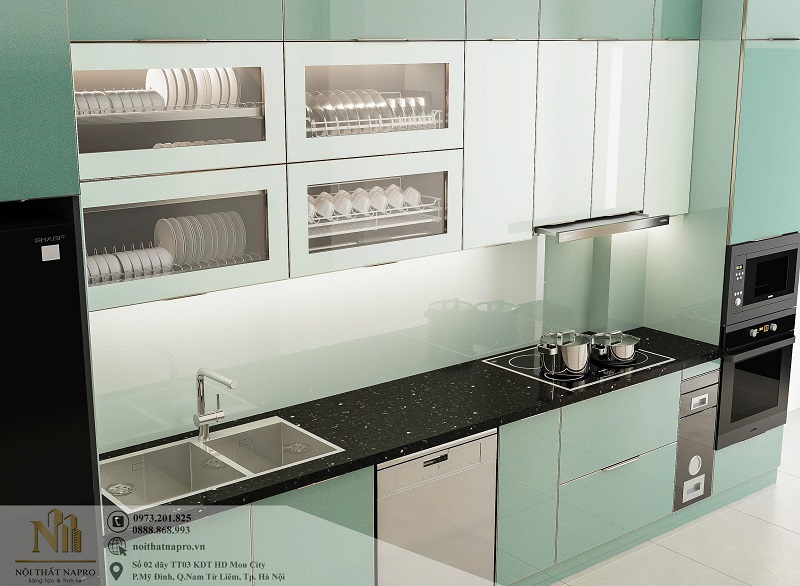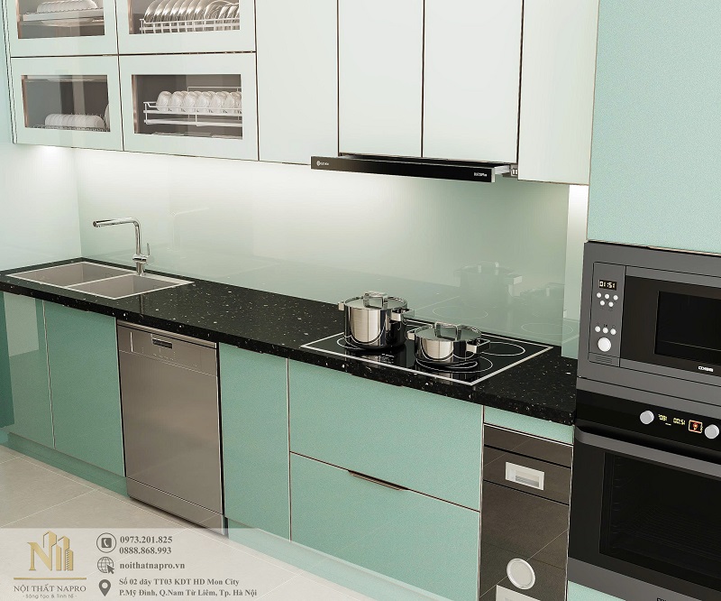 Gam màu xanh ngọc pastel kết hợp trắng sứ mang đến cảm giác nhẹ nhàng, thanh thoát, vừa tạo điểm nhấn trẻ trung, vừa giúp căn bếp trông rộng và sáng hơn. Đây cũng là sự lựa chọn lý tưởng cho những ai yêu thích phong cách hiện đại tối giản.