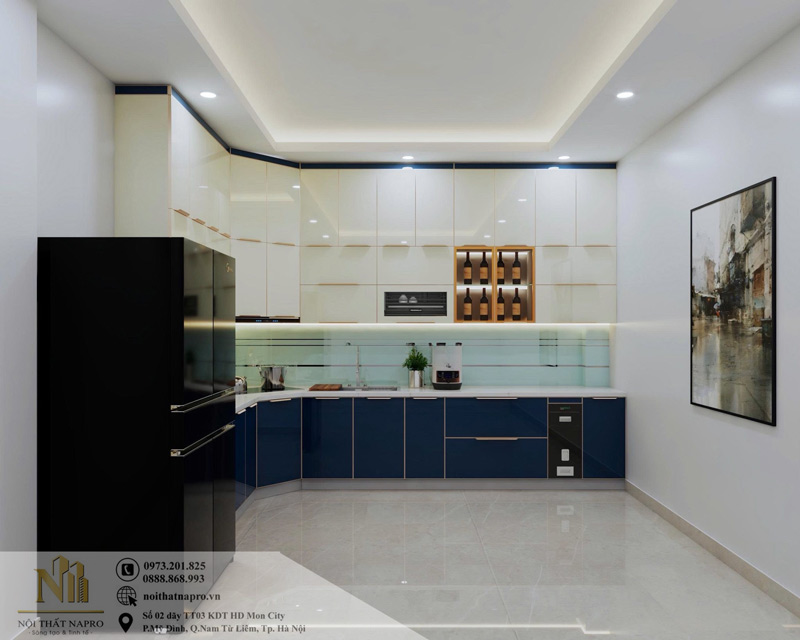 Bộ tủ bếp được thiết kế theo kiểu chữ L hiện đại, giúp tận dụng triệt để góc tường, tạo không gian nấu nướng khoa học và tiện nghi. Cách phối màu giữa xanh Navy trầm của tủ dưới và màu kem sáng của tủ trên mang đến cảm giác cân bằng, vừa nổi bật vừa thanh lịch.